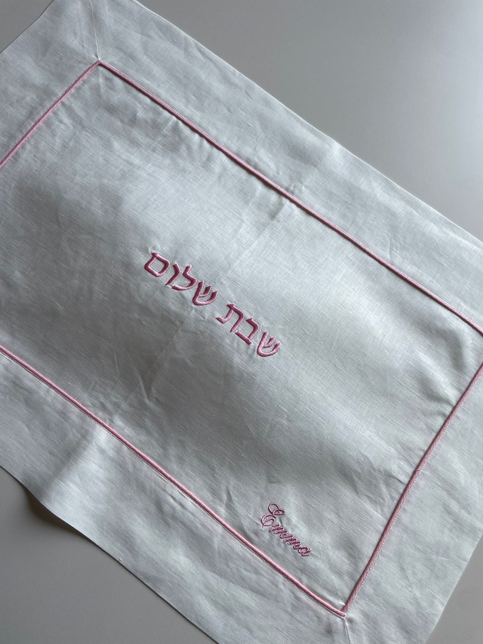 The challà cover can be customized with a different text and by adding a family crest or an image.