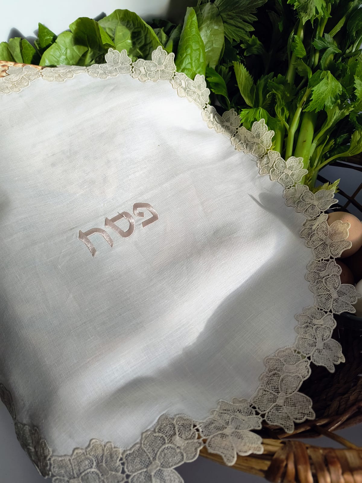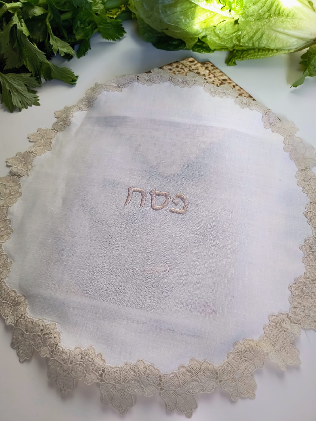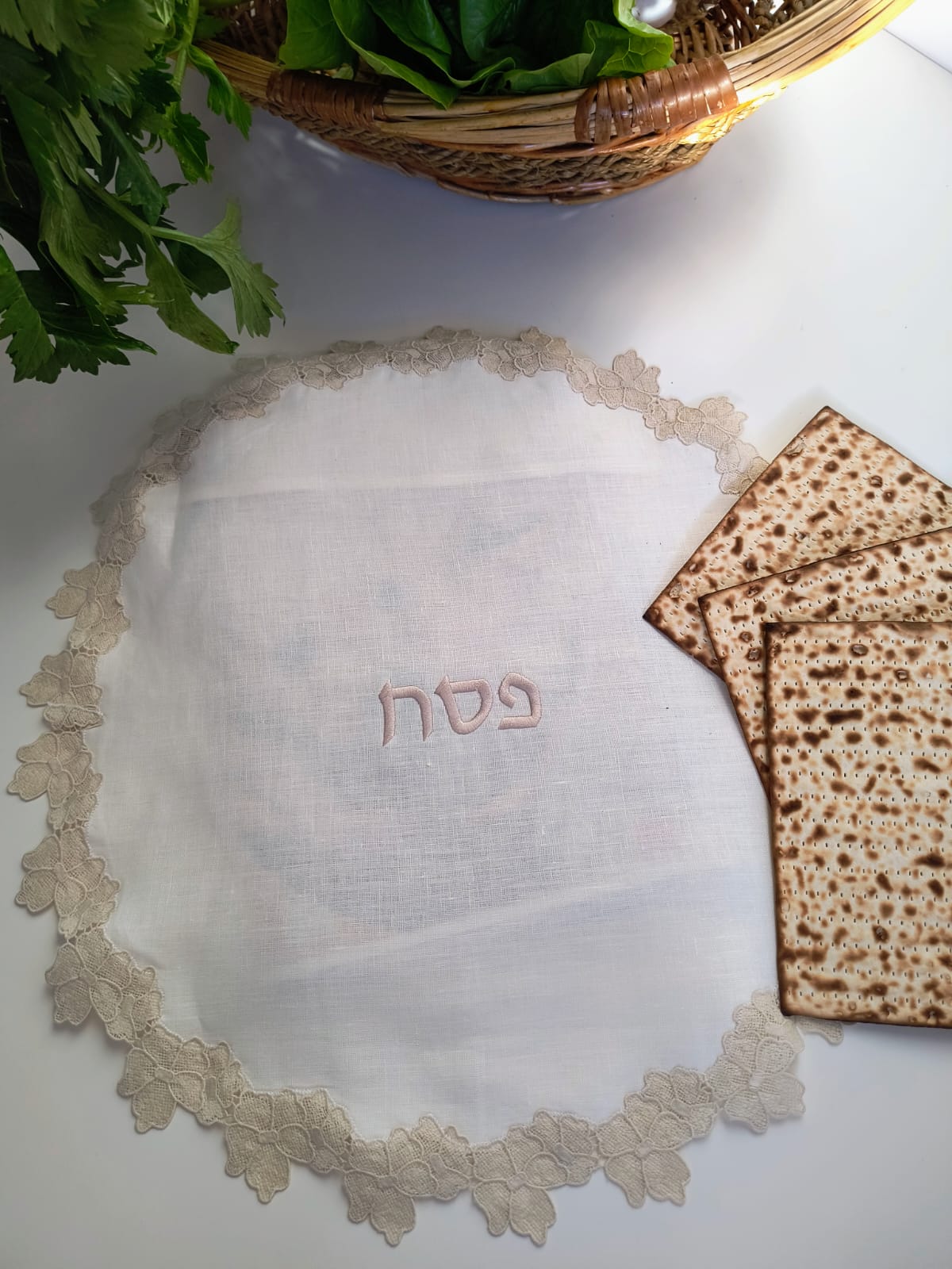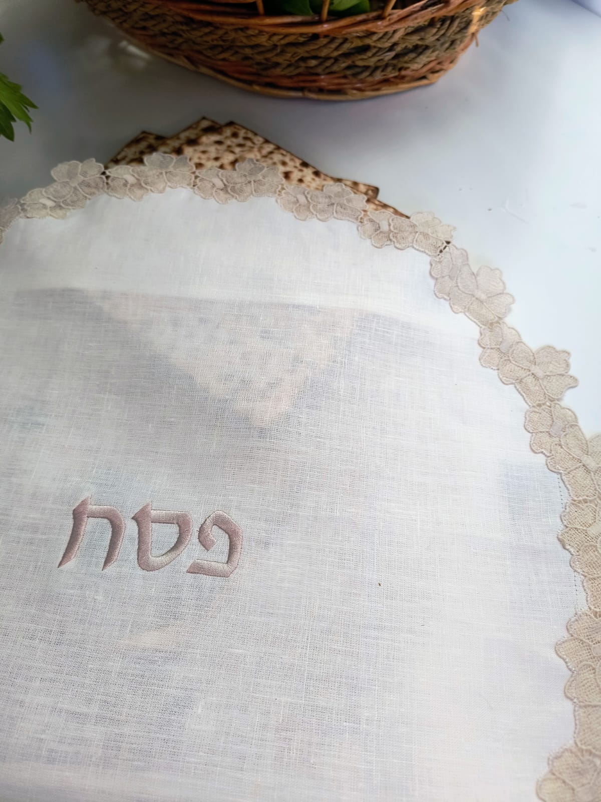 Elegant ivory linen and beige lace Matzah cover. The Matzah cover has a pocket that can host the 3 Matzot.