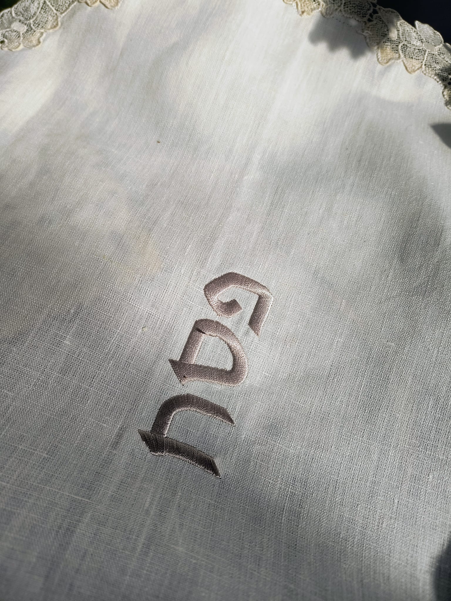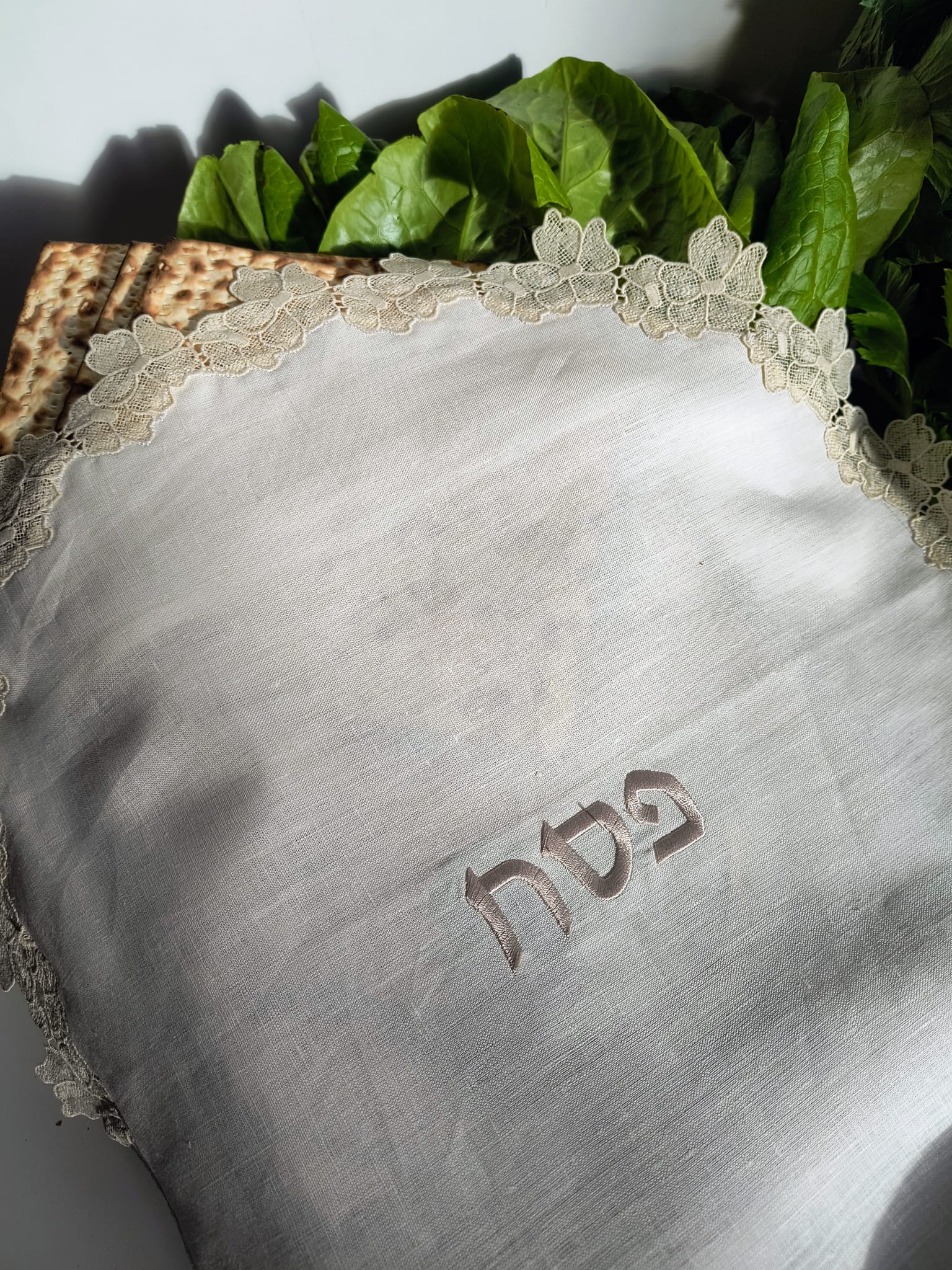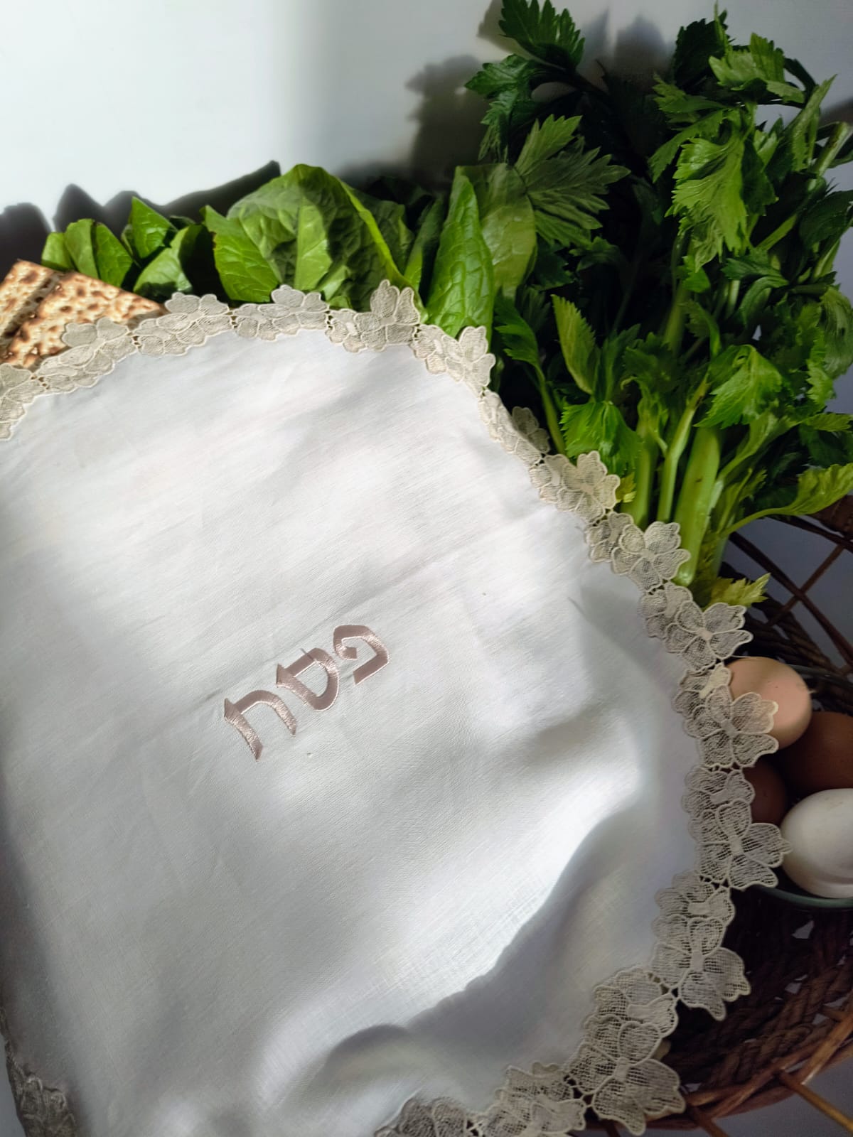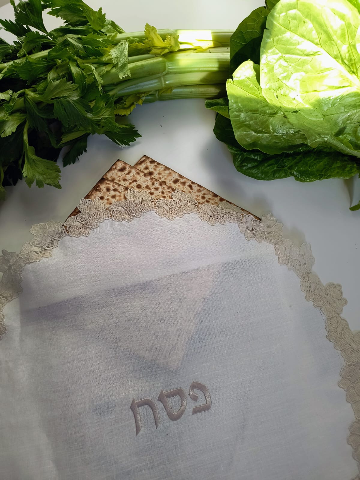Elegant ivory linen and beige lace Matzah cover. The Matzah cover has a pocket that can host the 3 Matzot.