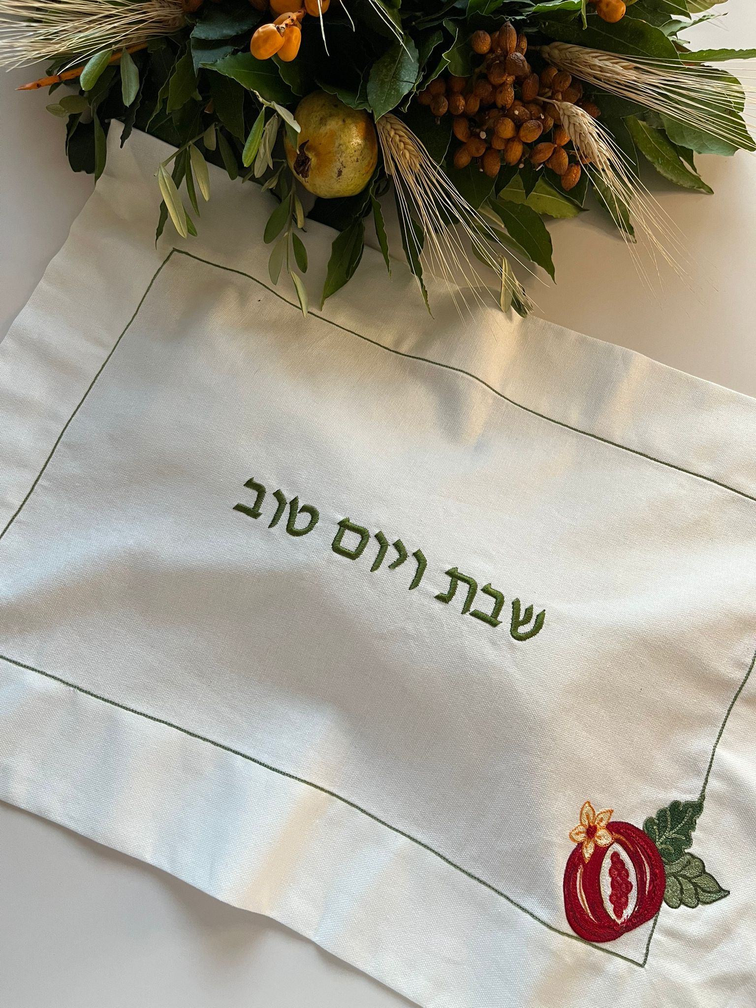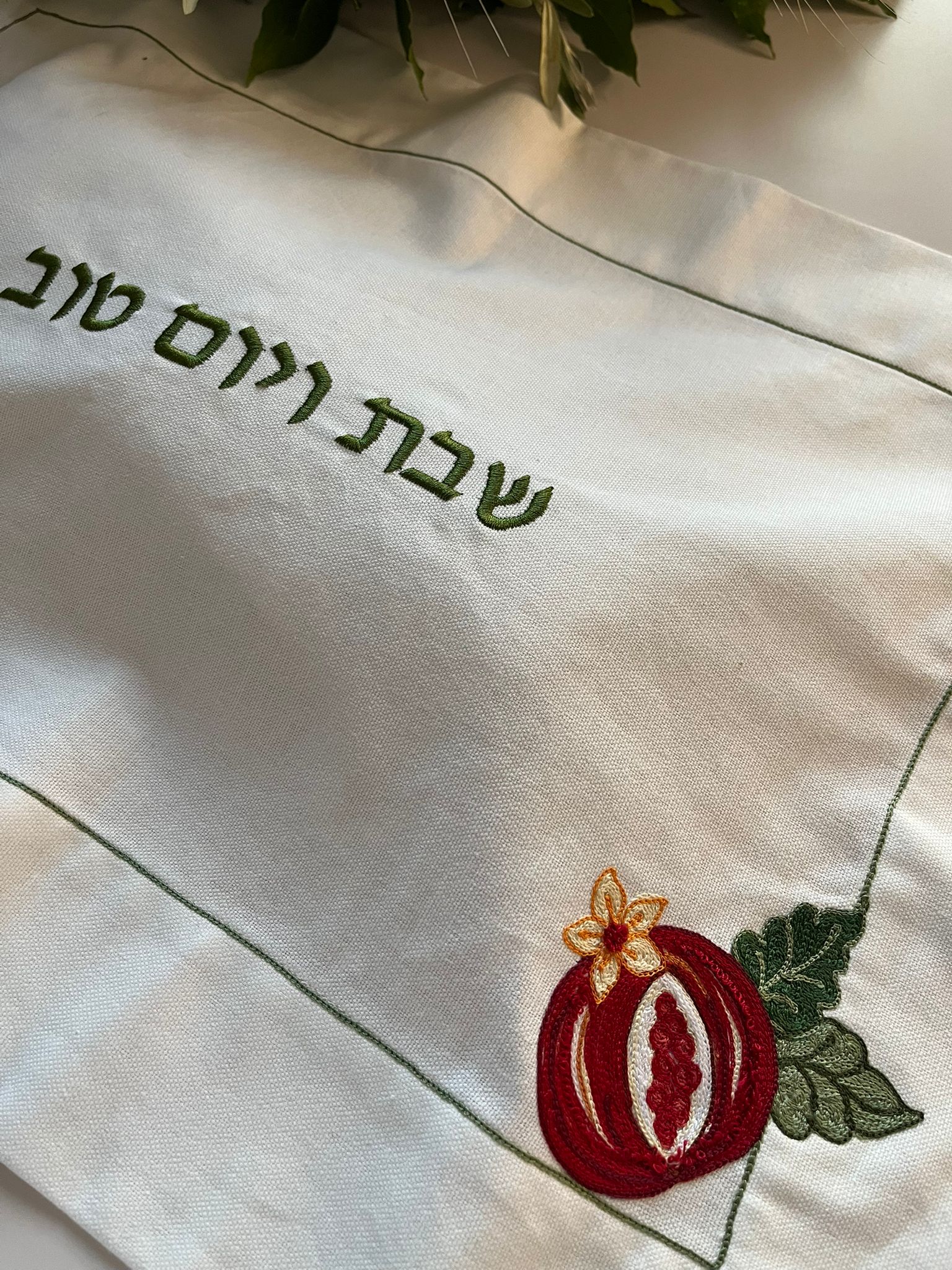 Elegant cotton challah cover with intricate Pomegranate embroidery.